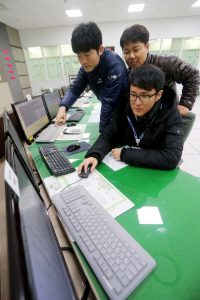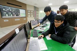 ▲삼성전자 임직원들이 수원 '삼성디지털시티' 내 전력감시실에서 전력 사용 현황을 면밀히 살펴보고 있다.
