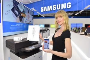 ▲삼성전자 모델이 10~14일 독일 하노버에서 열리는 세계적인 정보통신 전시회 'CeBIT 2014'에서 TV, 스마트폰, 갤럭시 카메라 등 다양한 삼성 스마트기기에서 '삼성 클라우드 프린트' 앱을 이용해 출력 문서의 공유 및 바로 출력이 가능한 '삼성 클라우드 프린트'를 소개하고 있다.