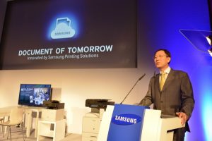 삼성전자는 9일 하노버 엑스포월(ExpoWal)에서 열린 기자 간담회서 '미래의 문서(Document of Tomorrow)'란 주제로 삼성 프린팅의 혁신의 역사와 중장기 비전을 선보였다.