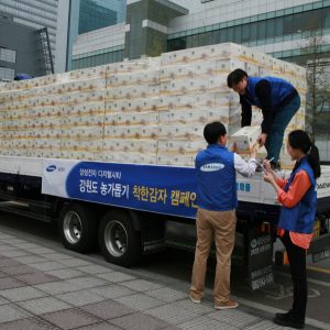 ▲ 삼성전자가 감자 풍작과 소비저하로 어려움을 겪고 있는 강원도 감자농가를 돕기 위해 '1석3조 착한감자' 캠페인을 펼쳤다. 이번 캠페인을 통해 삼성전자가 구입한 감자는 총 40,000kg(5kg, 8천 박스)으로, 회사가 수원 사내 식당용으로 20,000kg을 구입했고, 임직원들은 본인 구매·푸드 뱅크(Food Bank) 기증 중 선택해 20,000kg을 구입했다.