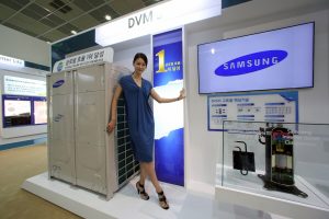 ▲[삼성전자] 2013 대한민국 에너지 대전 삼성 전시관에서 삼성 모델이 글로벌 효율 1위를 달성한 삼성 시스템에어컨 DVM S 를 소개하고 있다.