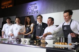 (왼쪽 두번째부터)제품의 기획과 개발에 참여한 에릭 트로숑(Eric Trochon) 셰프, 삼성전자 냉장고 모델 배우 전지현, 삼성전자 CE부문 윤부근 사장, 미셸 트로아그로(Michel Troisgros) 셰프가 요리시연을 하고 있다.