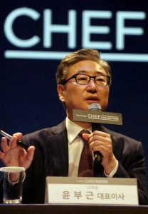 ▲삼성전자가 12일 장충동 신라호텔에서 개최한 '셰프컬렉션 냉장고' 미디어데이 행사에서 삼성전자 CE부문 윤부근 사장이 신제품에 대해 설명하고 있다.