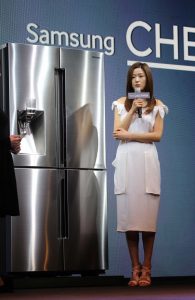 ▲삼성전자가 12일 장충동 신라호텔에서 개최한 '셰프컬렉션 냉장고' 미디어데이 행사에서 삼성전자 냉장고 모델 배우 전지현이 신제품 '셰프컬렉션 냉장고'를 소개하고 있다.