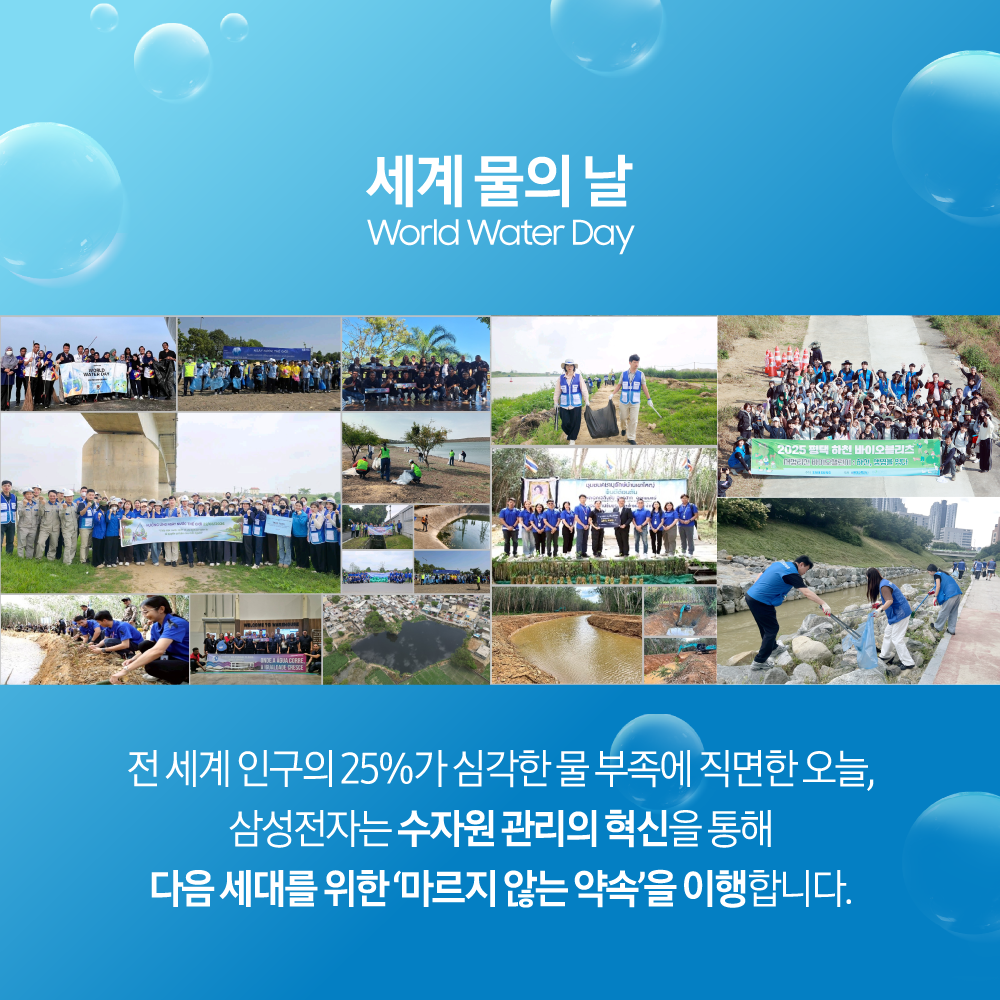 삼성전자가 3월 22일 제34회 ‘세계 물의 날’을 기념해 수자원 보호를 위한 다채로운 캠페인을 전개했다. ‘세계 물의 날’은 전 세계적인 물 부족 현상과 수질 오염에 대한 경각심을 일깨우고자 지난 1992년 유엔(UN)이 공식 제정한 날이다.