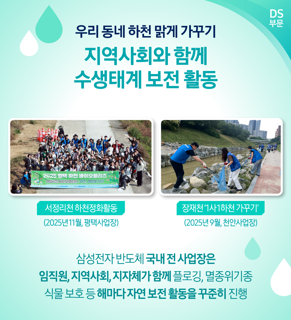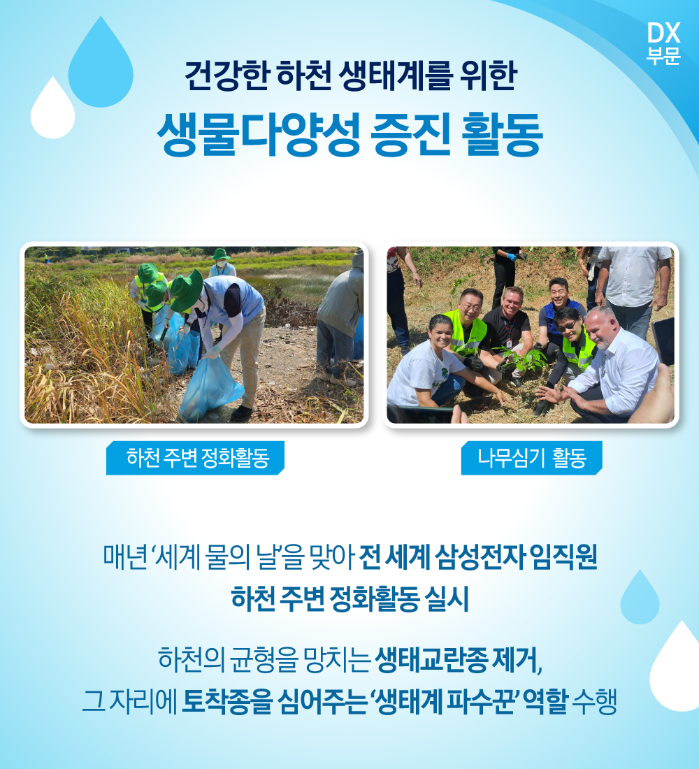 올해는 삼성전자의 국내외 전 법인과 사업장은 생물다양성 활동부터 사내외 수자원 활동, 취약계층을 위한 긴급 식수지원에 이르기까지 다방면으로 환경 보호에 앞장섰다.