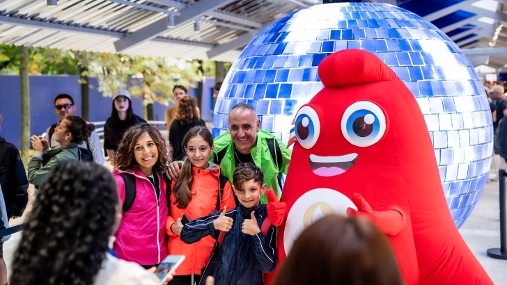 ▲ 조세핀 크리스토퍼센(Josefine Christoffersen, 스웨덴)은 마리니 광장(Square Marigny)에 위치한 삼성 올림픽 체험관에서 2024 파리 올림픽 공식 마스코트인 프리주와 함께 포즈를 취하고 있다.
