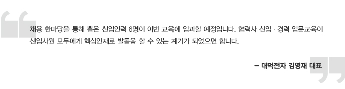한편, 협력사 신입입문교육은 총 13개의 차수로 구성됐으며 차수당 60명 이하로 3박 4일의 집합 교육이 진행됩니다. 또한, 모든 협력사는 100% 무상교육을 지원 받을 수 있습니다.