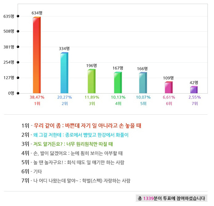 직장인이라면 이런 경우 가끔 경험 하시죠? 학교를 벗어나 회사에 입사하게 되면 원치 않아도 이런 일들을 경험하게 됩니다. 자기 때문이 아닌 것 같은데 혼날 때 참으로 난감하면서도 서운한 감정이 밀려 들게 되죠. 총 334 분이 선택해 주셔서 2위를 차지했는데요, 마음 속으로 뜨끔하고 계신 분들 있으시다면 지금 바로 달려가 한 번 꼬~옥 안아주세요. ^^