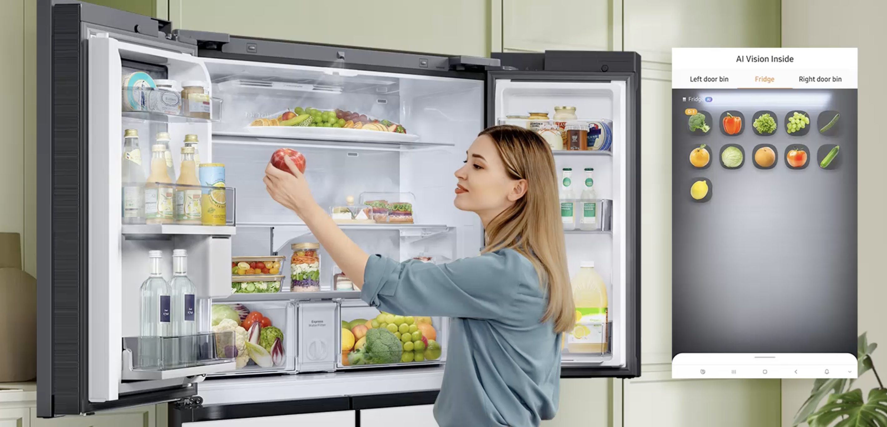 6.- Refrigerador Bespoke 4-Door Flex con AI Vision Inside: El recurso IA Vision Inside identifica automáticamente los alimentos en su interior. Ayuda a reducir el desperdicio al sugerir recetas basadas en los ingredientes disponibles y sus fechas de caducidad.