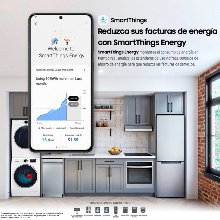 Además el usuario puede controlar su equipo WindFree a travpes de la plataforma SmartThings. Esta integración facilita que los usuarios monitoreen y ajusten el consumo energético en tiempo real, activando modos de ahorro de energía que contribuyen a un uso más eficiente sin comprometer el confort. A través de la app puedes monitorear el consumo energètico diario, semanal y mensual, y ajustarlo para garantizar la máxima eficiencia energética.