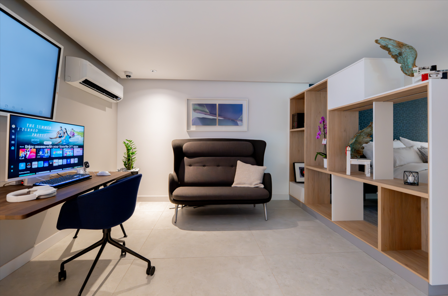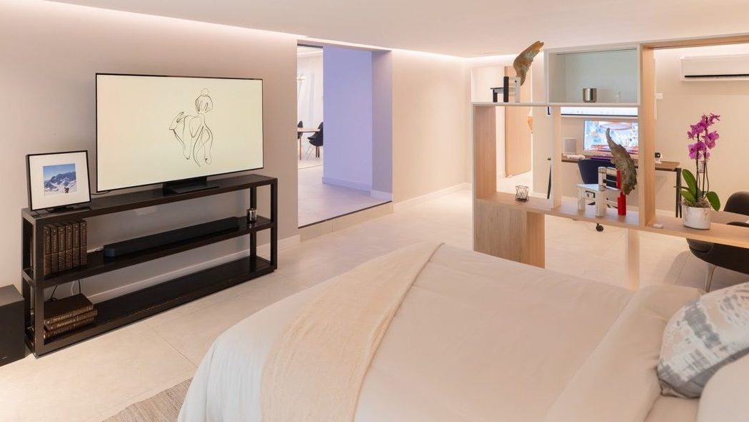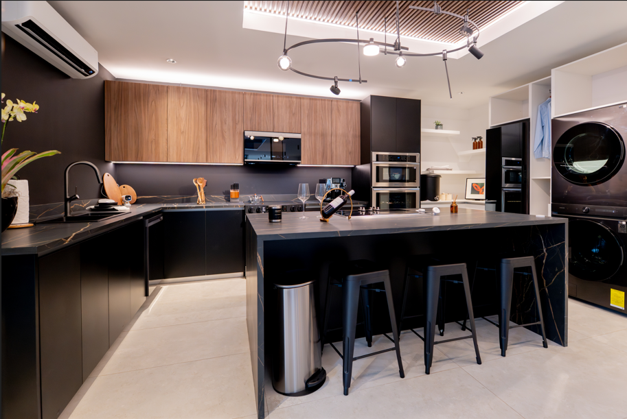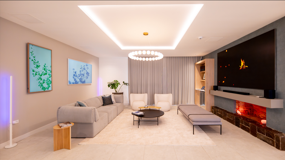 Cada ambiente se transforma de acuerdo con las preferencias del usuario. En la sala principal, por ejemplo, un simple comando activa el Modo Película, bajando las cortinas, ajustando la temperatura y creando una atmósfera cinematográfica. Para los amantes del gaming, el Modo Juego sincroniza luces y sonido con la acción en pantalla, mientras el aire acondicionado WindFree mantiene el confort ideal.