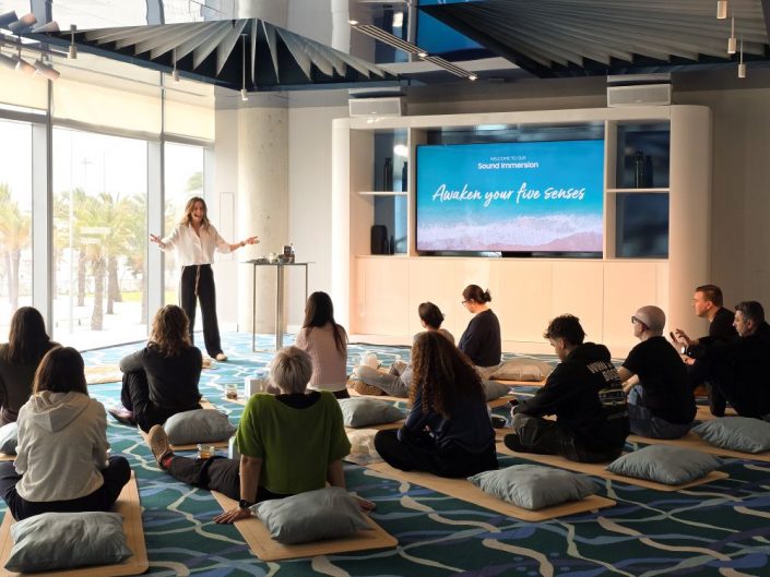 En el marco del Mobile World Congress, Samsung Electronics realizó el Sound Immersion, una experiencia de meditación diseñada para despertar los cinco sentidos. Periodistas y creadores de contenido disfrutaron de esta pausa reparadora a través de meditaciones con audio inmersivo de los Galaxy Buds4 Pro y complementadas con información de bienestar en tiempo real del Galaxy Watch8