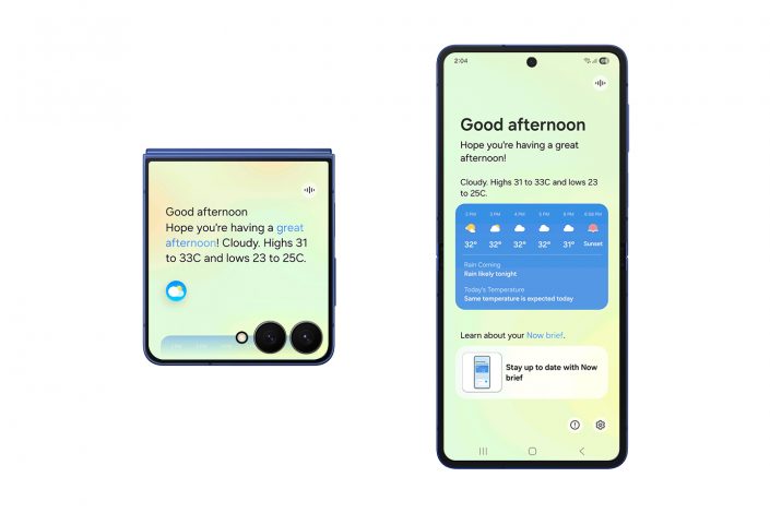 - Now Brief[3] ofrece actualizaciones diarias aún más personalizadas, incluyendo el tráfico, recordatorios importantes y Samsung Moments, que permite a los usuarios reflexionar sobre sus rutinas diarias. También pueden recibir sugerencias y recomendaciones personalizadas, como selecciones de música y video basadas en sus suscripciones e intereses. Además, los usuarios tienen fácil acceso a información personalizada sobre salud desde Galaxy Watch.