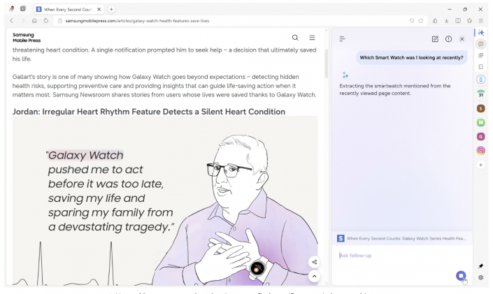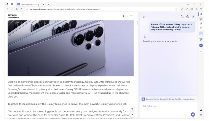 Samsung presenta un nuevo asistente impulsado por IA integrado en Samsung Internet que lleva la agentic AI directamente a la experiencia de navegación en colaboración con Perplexity. Samsung Internet está diseñado para comprender el lenguaje natural y el contexto de la página que los usuarios están viendo, así como la actividad en las pestañas, lo que facilita la exploración de contenido y la toma de medidas.[4]