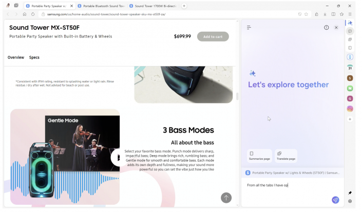 - Conciencia del contexto en múltiples pestañas: Los usuarios ya no necesitan hacer clic en varias pestañas para comparar información. Samsung Internet puede resumir y comparar contenido de varias pestañas a la vez. Esto facilita la obtención de información clave de diferentes fuentes en una sola vista.