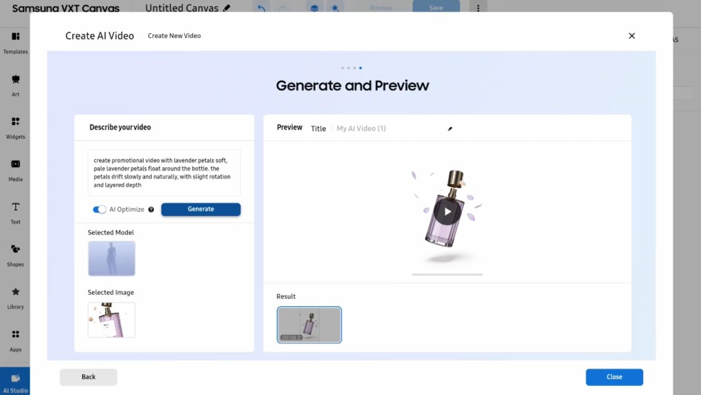 Si la creación y gestión de contenidos son una preocupación, Samsung VXT (Visual eXperience Transformation) ofrece la solución ideal. A través de esta plataforma, las empresas pueden gestionar de forma remota las pantallas conectadas[3] y crear fácilmente contenido de video listo para su emisión. Con la aplicación AI Studio[4], integrada actualmente en Samsung VXT, los usuarios pueden generar contenido optimizado para señalización partiendo únicamente de una imagen del producto y un comando de texto (prompt).