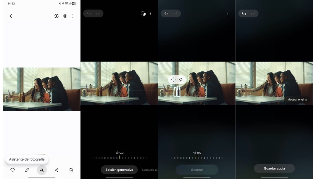 - Ajusta, genera la nueva imagen y guárdala: Después de seleccionar el objeto, puedes redimensionarlo, moverlo (manteniéndolo presionado) o incluso eliminarlo. Si quieres enderezar la imagen, utiliza el indicador de inclinación. Cuando estés satisfecho, toca en “Generar” para que Galaxy AI procese y recree la imagen de la forma más natural posible. Finalmente, haz clic en “Guardar copia” para guardar la nueva versión como una copia, conservando la original[1].