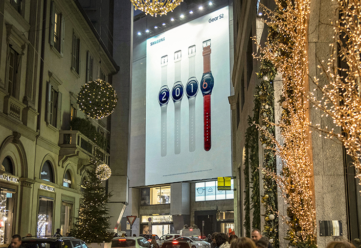December is half over and New Year’s Day is just around the corner. Getting into the holiday spirit of “in with the new,” Samsung launched a new out of home (OOH) advertising campaign. Seasonal signage, interactive billboards, metro station takeovers and pop-up stores celebrate the new wearable and the new year to come.