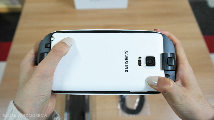 Now that we have the Gear VR and the Galaxy Note 4 ready in hand, let’s walk through how to get started and what to expect. To connect the Galaxy Note 4 to the Gear VR, first remove the front protective cover and press the phone lock key to release the connective port, which will raise upwards when released.