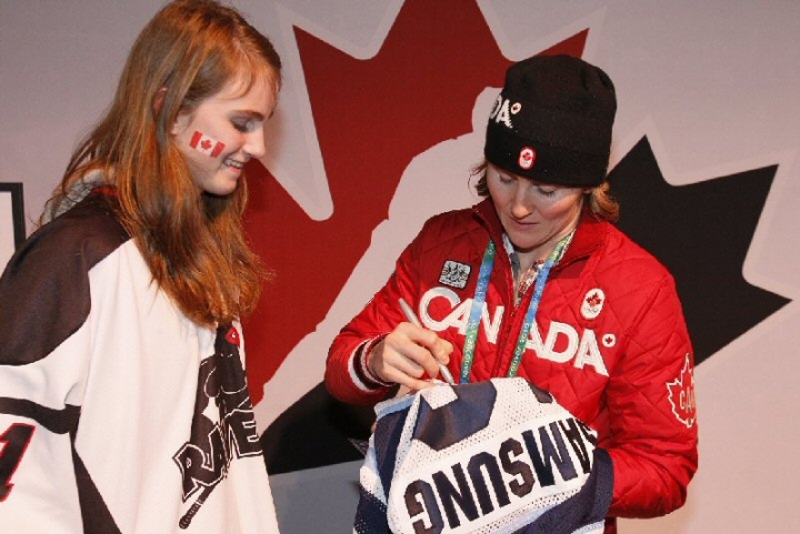 (Samsung Electronics Co., Ltd., the Worldwide Olympic Partner for Wireless Communications Equipment, welcomed the local North Shore Ravens Bantam Girls Hockey Team to the Olympic Rendezvous @ Samsung (OR@S) pavilion on February 13th for a day that Olympic dreams are made of. The girls were selected through the contest, Hooray for Hayley, a Samsung initiative that brings kids together at the Vancouver 2010 Olympic Winter Games through the chance to watch their hockey hero, Hayley Wickenheiser, a three-time Olympic medalist, Canadian Women’s Ice Hockey captain, and member of Team Samsung.)
