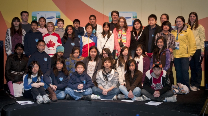 Students from Mackenzie Elementary take in an Eco-Class Day and learn the lessons of climate change at the Olympic Rendezvous @ Samsung and finish with a class photo with James Balog (centre back), guest teacher and Samsung Eco-Ambassador for the Vancouver 2010 Olympic Winter Games. The Eco-Class also drew attention from Canadian Samsung Mobile Explorers (right back) who will share their pavilion experience online with their families and friends back home in Atlantic Canada and around the world.
