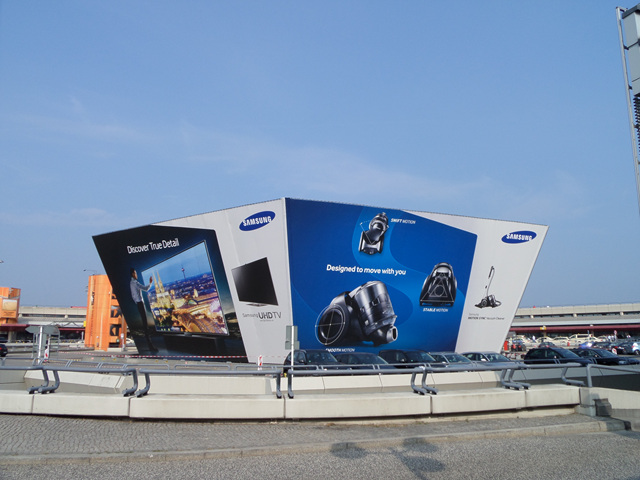 Samsung Electronics built various outdoor advertising signs ahead of IFA 2013 to greet visitors in Berlin Germany. Samsung Electronics set the mood for the big event building billboard signs for UHD TVs, Food Showcase Refrigerators, Motion Sync Vacuum Cleaners, and Eco Bubble Washers at major landmarks in Berlin such as Berlin International Airport in Tegel, Potsdam Square, Messe Exhibition Center, and others.