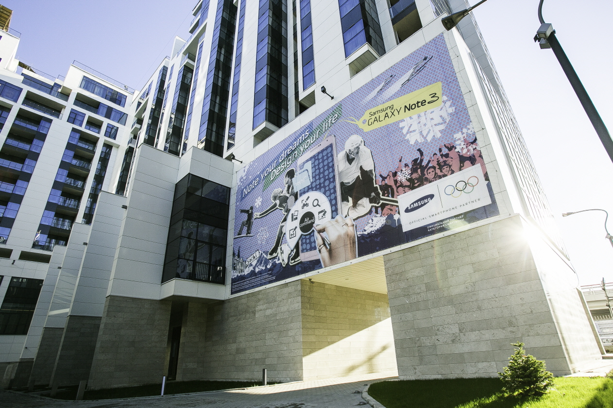 Samsung’s Sochi 2014 outdoor advertising campaign displayed on the Russian Seasons Hotel in Olympic Park, Sochi. The campaign is running on 55 landmark locations throughout Sochi and expresses the theme, “Note your dreams; Design your life” through featured athletes and devices.