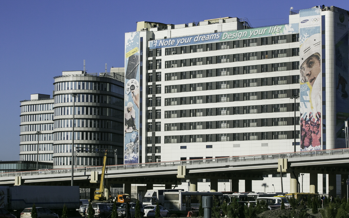 Samsung’s Sochi 2014 outdoor advertising campaign displayed on the Russian Seasons Hotel in Olympic Park, Sochi. The campaign is running on 55 landmark locations throughout Sochi and expresses the theme, “Note your dreams; Design your life” through featured athletes and devices.