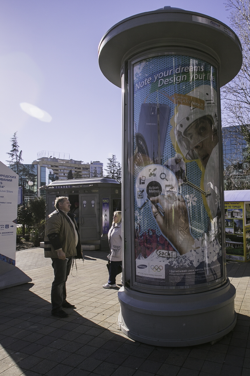 삼성전자가 러시아 소치에서 열리는 소치 동계올림픽을 맞이해 소치 시내에 대형 옥외광고를 설치하며 본격적인 현장 마케팅 캠페인을 개시했다. 이번 소치올림픽 옥외광고는 크루즈, 호텔, 버스, 빌보드 등 소치 시내에 55개 장소에 설치되며, 올림픽 공식 폰 갤럭시 노트3와 소치올림픽에 출전하는 러시아 선수 에브게니 말킨, 호주 선수 알렉스 풀린 등 갤럭시팀 선수들을 선보인다.