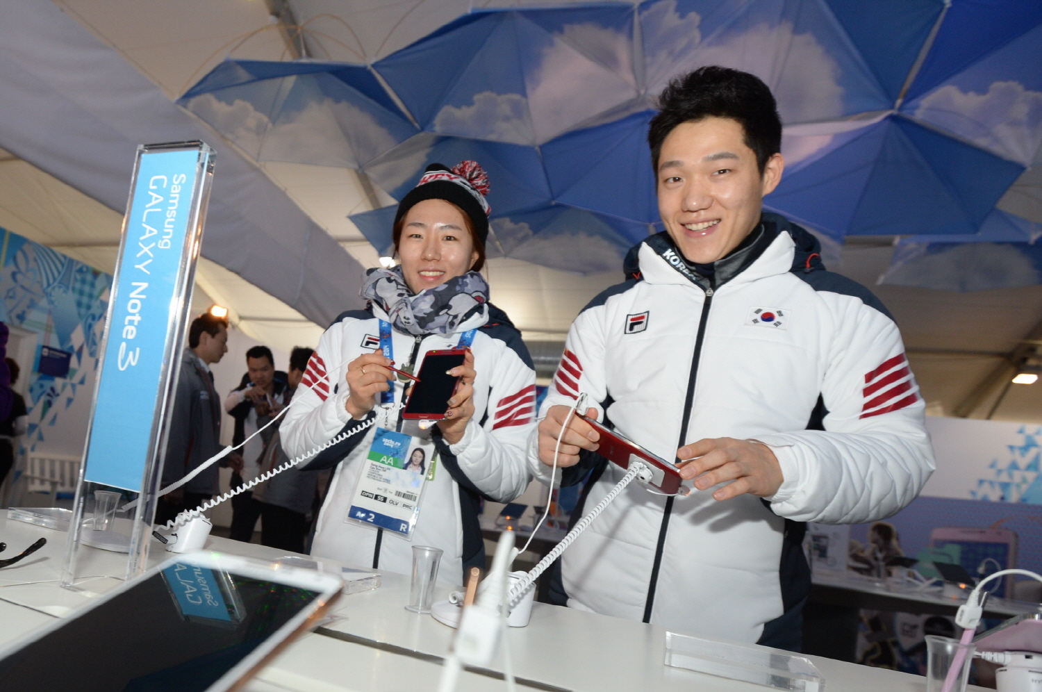 삼성전자가 5일(현지시간) 러시아 소치 올림픽 파크에서 열린 '갤럭시 올림픽 파크 스튜디오'를 개관했다. 이날 올림픽 선수촌에 입촌한 한국 대표팀도 갤럭시 스튜디오를 방문했다. (이상화 선수와 모태범 선수, 한국 선수단의 모습)