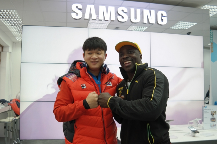 At the Samsung GALAXY Studio opening during the Winter Olympic Games in Sochi, Korean bobsleigh team including Kim Dong-hyun, Kim Sik, and Won Yun-jong met with Jamaican bobsledder Winston Watts.