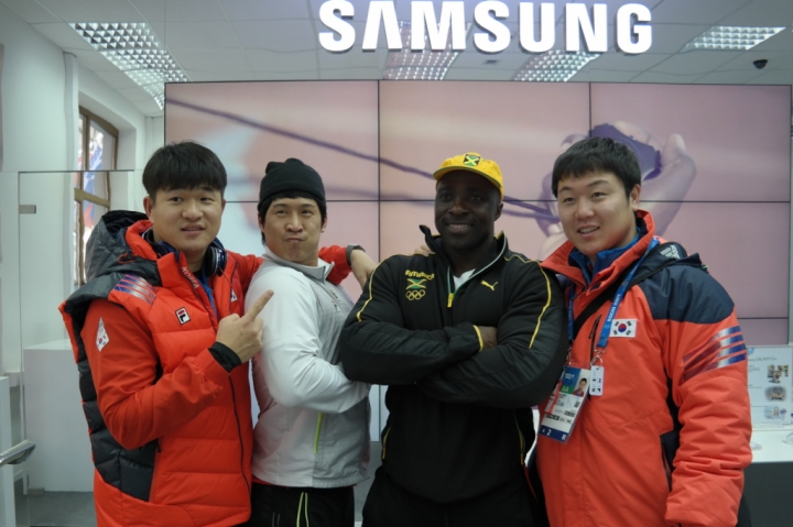 At the Samsung GALAXY Studio opening during the Winter Olympic Games in Sochi, Korean bobsleigh team including Kim Dong-hyun, Kim Sik, and Won Yun-jong met with Jamaican bobsledder Winston Watts.