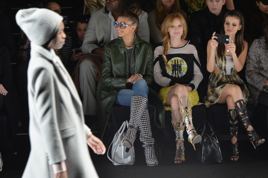Victoria Justice uses a Samsung Galaxy Note 3, with limited-edition Swarovski cover, at the Rebecca Minkoff show during Mercedes-Benz Fashion Week Fall 2014 at Lincoln Center on February 7, 2014 in New York City.