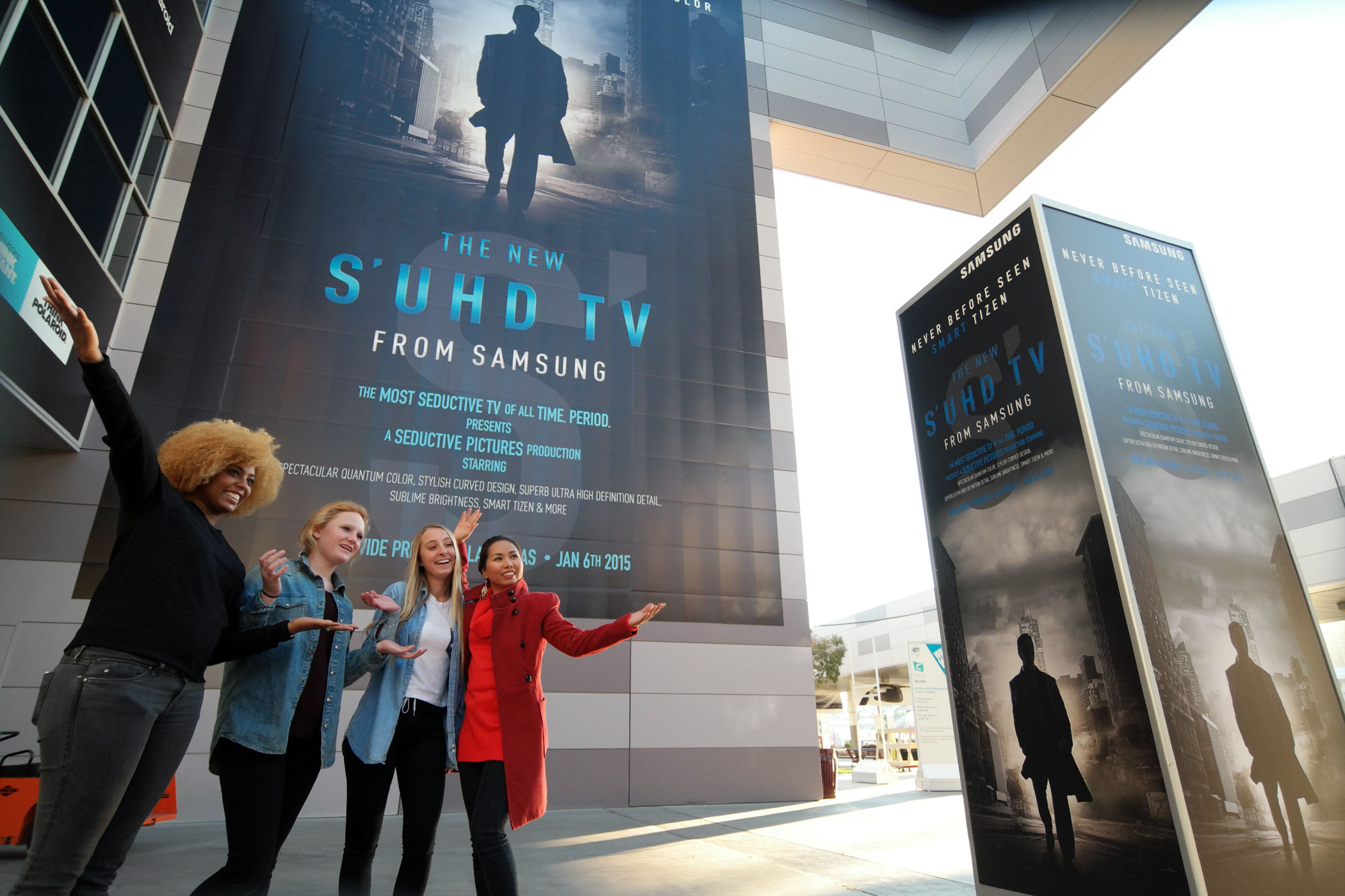 Samsung Electronics built a large outdoor signage displaying promoting new SUHD TV at the Las Vegas Convention Center ahead of CES 2015 opening on the 6th the local time. Samsung staff are posing for a photo in front of the building.