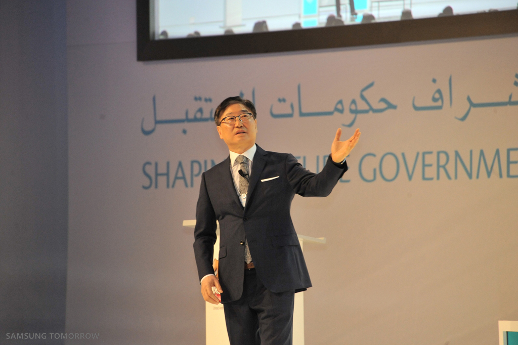 The President and CEO of Samsung Electronics, BK Yoon, delivered a speech at the Government Summit in Dubai, United Arab Emirates on Feb 9, outlining Samsung Electronics’ innovative strategies and its vision for the future. The 2015 Government Summit was the third annual session hosted by the Prime Minister and Vice-President of the UAE, Sheikh Mohammed Bin Rashid Al Maktoum. Three thousand of the world’s foremost leaders were in attendance at this year’s Summit, gathering in the public sector to share and discuss the best practices from around the world. As a guest speaker at the Summit, Mr. Yoon was invited not only to inspire innovation in each participating government, but also to share innovative experiences in smartphones, LED TV, smart refrigerators, and other consumer electronics and appliances. Samsung is planning on expanding its reach into the Arab market with a population of 370 million, and to drive more business in Middle Eastern regions through B2B projects and IoT businesses