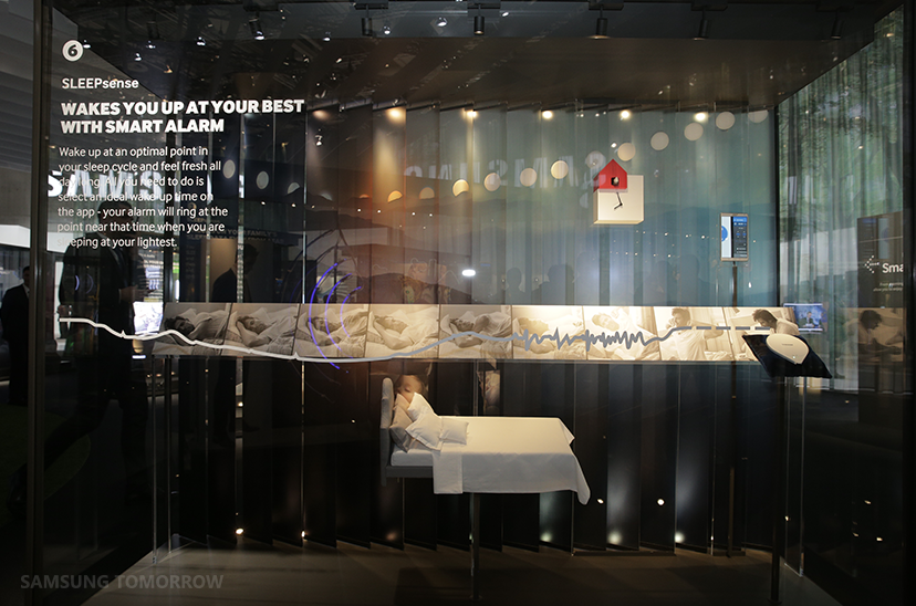 The IoT Zone is a peaceful, reflective area in the middle of Samsung’s exhibition space. It’s a circular space, symbolizing the infinite and boundless possibilities of the IoT. With 24 glass showcases, arranged like the pages of a popup book, the IoT Zone explores four major aspects of our approach to the IoT: SleepSense, the SmartThings platform, Smart TV and the Gear S2.