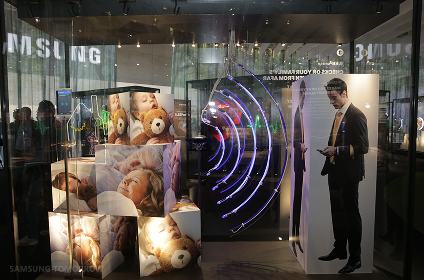 The IoT Zone is a peaceful, reflective area in the middle of Samsung’s exhibition space. It’s a circular space, symbolizing the infinite and boundless possibilities of the IoT. With 24 glass showcases, arranged like the pages of a popup book, the IoT Zone explores four major aspects of our approach to the IoT: SleepSense, the SmartThings platform, Smart TV and the Gear S2.