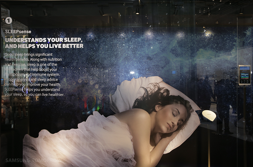 The IoT Zone is a peaceful, reflective area in the middle of Samsung’s exhibition space. It’s a circular space, symbolizing the infinite and boundless possibilities of the IoT. With 24 glass showcases, arranged like the pages of a popup book, the IoT Zone explores four major aspects of our approach to the IoT: SleepSense, the SmartThings platform, Smart TV and the Gear S2.