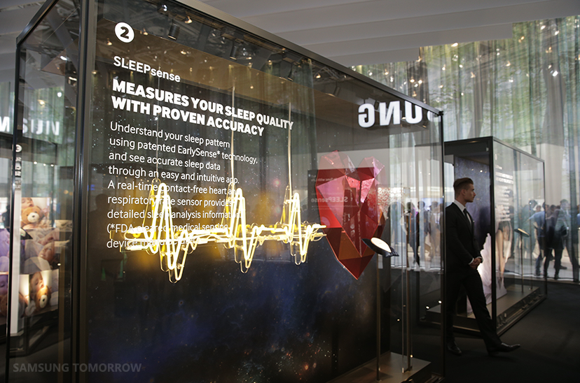 The IoT Zone is a peaceful, reflective area in the middle of Samsung’s exhibition space. It’s a circular space, symbolizing the infinite and boundless possibilities of the IoT. With 24 glass showcases, arranged like the pages of a popup book, the IoT Zone explores four major aspects of our approach to the IoT: SleepSense, the SmartThings platform, Smart TV and the Gear S2.