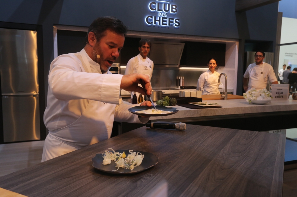 For the chefs at home, we have four delicious and colorful stories to tell you. At IFA 2014, four of Samsung’s Club des Chefs: Michel Troisgros, Christopher Kostow, Davide Oldani, and Elena Arzak prepared four wonderful meals based on four different color themes: white, brown, yellow, and green, using one of Samsung Chef Collection, at the premium lounge. Let’s hear how the four famous chefs cooked four multicolored dishes one by one.