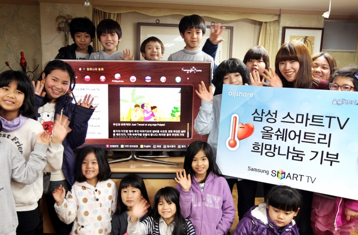 삼성전자가 지난 30일, '올쉐어트리 희망 나눔 이벤트'에 참여한 2만여 명의 희망을 담아 다문화 가정 어린이 공부방에 50형 스마트TV 3대를 증정했다. 이번 기부는 지난해 연말부터 1월 28일까지 현장참여와 온라인참여로 진행된 '올쉐어트리 희망나눔 이벤트'에 따른 것으로, 참여자가 2만 명이 넘으면 스마트TV를 기부하는 공익성 캠페인으로 기획됐다. 현장에서는 지난해 12월 21일부터 1월 6일까지 잠실 롯데월드에 마련된 6m 높이의 초대형 '올쉐어(AllShare) 트리'에 1만 2천여명의 관람객들이 직접 작성한 희망 메시지를 전했다.