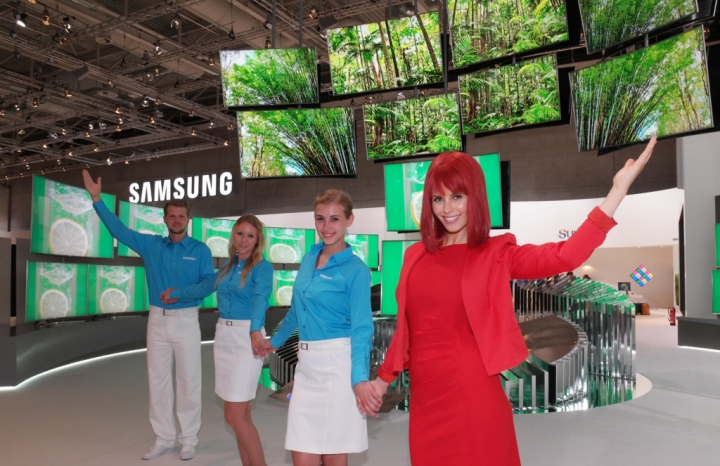 Models are posing with new products at the IFA 2015 exhibition hall
