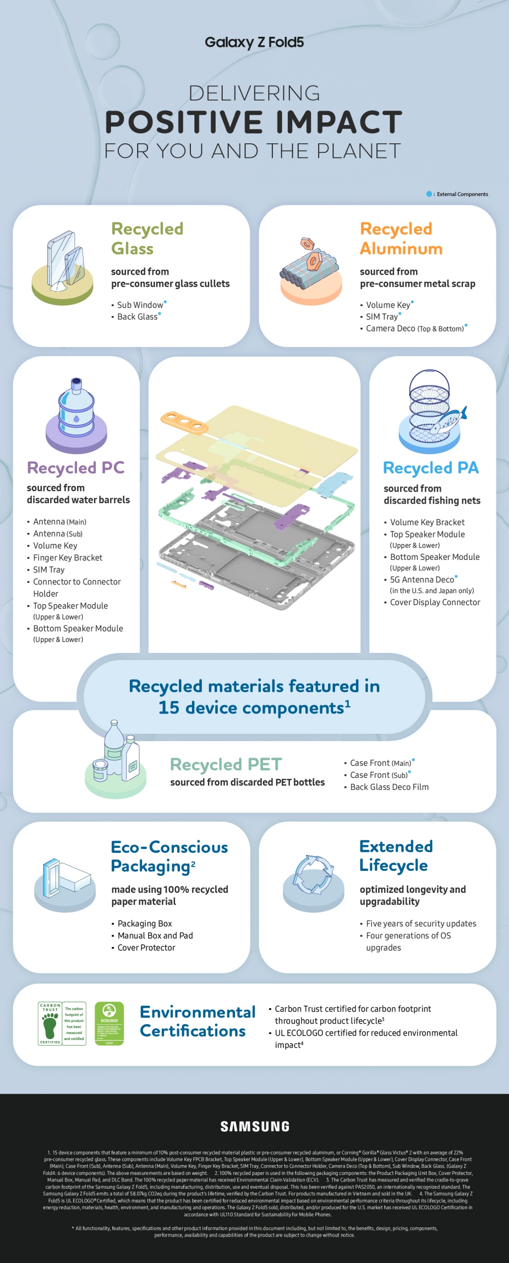 Samsung Electronics is on a journey to open more possibilities for people and the planet, and essential to this journey is creating a human-centric mobile experience with more recycled materials, without compromise. The new Galaxy Z Flip5 and Z Fold5 represent yet another step in this commitment to design technology that breaks barriers while aiming to minimize the impact on the environment.