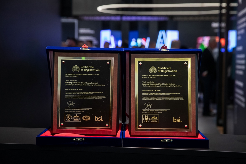 Samsung Electronics, the global number one digital signage provider for 14 consecutive years,1 today announced that it has achieved ISO/IEC 27001:2022 and ISO/IEC 27701:2019 certifications from the British Standards Institution (BSI) for its digital signage content management systems (CMSs). The three systems awarded with the certifications are the Samsung Visual eXperience Transformation (VXT) platform, MagicINFO™ and LYNK Cloud™.
