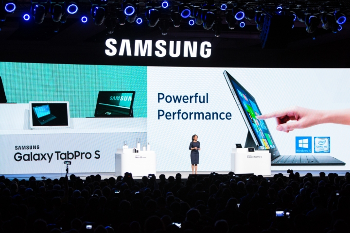 Alanna Cotton, VP at Samsung Electronics America, described the features of the Galaxy TabPro S at the Samsung Press Conference at CES 2106 on Jan. 5.