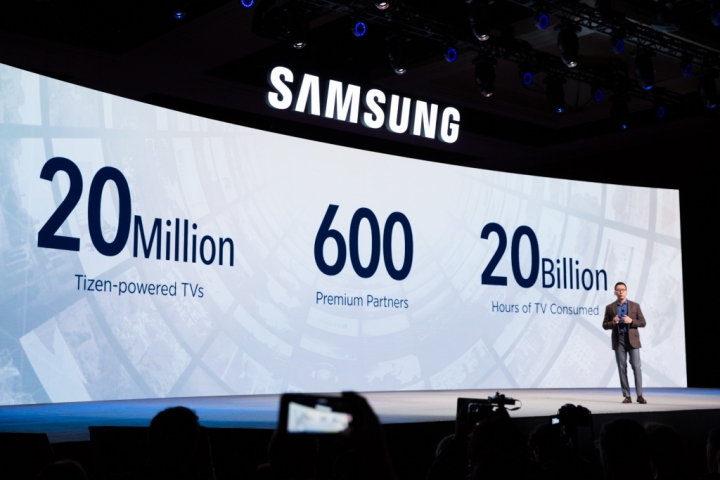 Won Jin Lee, EVP at Samsung Electronics, told the audience about Smart TV sales for 2015, and described how the Smart Hub and Smart Control remote are simplifying to TV-watching experience. From the Samsung Press Conference at CES 2016 on Jan. 5.
