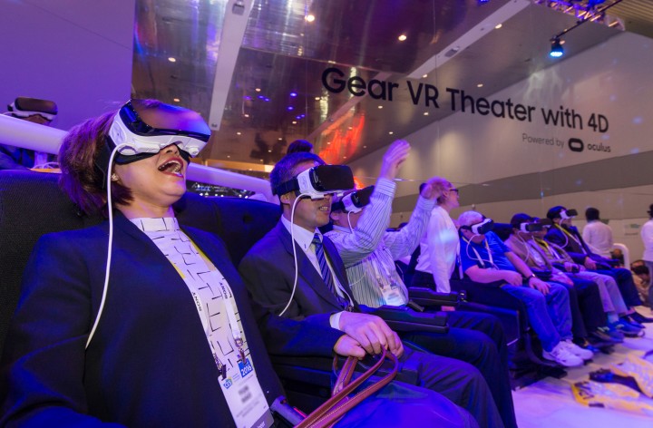 Samsung delights CES 2016 attendees at the Gear VR Theater with 4D at the Samsung Galaxy Studio (Las Vegas Convention Center, Main Concourse, GL10). The experience showcases immersive virtual reality content such as "Wooden Coaster," "Horror Maze" and "Surfing in Tahiti."