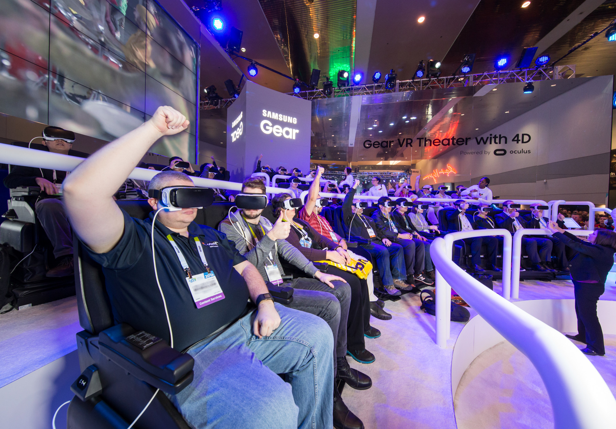 Samsung delights CES 2016 attendees at the Gear VR Theater with 4D at the Samsung Galaxy Studio (Las Vegas Convention Center, Main Concourse, GL10). The experience showcases immersive virtual reality content such as "Wooden Coaster," "Horror Maze" and "Surfing in Tahiti."