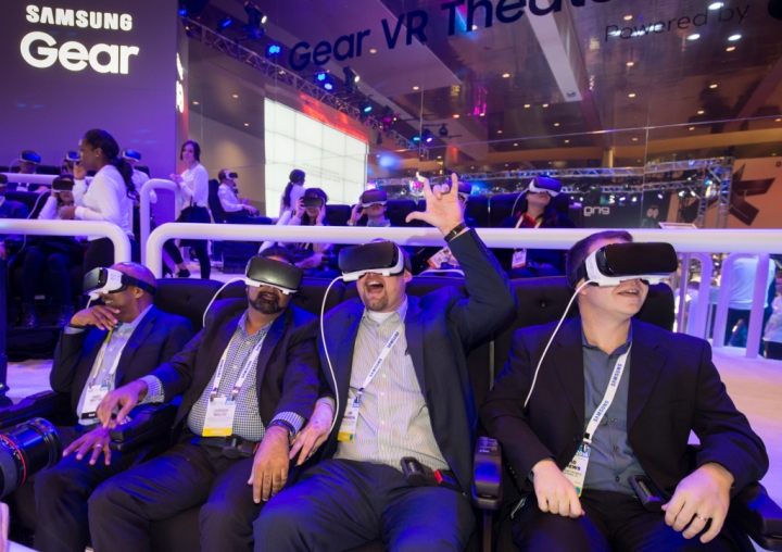 Samsung delights CES 2016 attendees at the Gear VR Theater with 4D at the Samsung Galaxy Studio (Las Vegas Convention Center, Main Concourse, GL10). The experience showcases immersive virtual reality content such as "Wooden Coaster," "Horror Maze" and "Surfing in Tahiti."